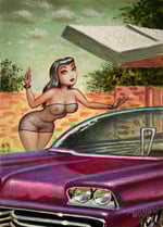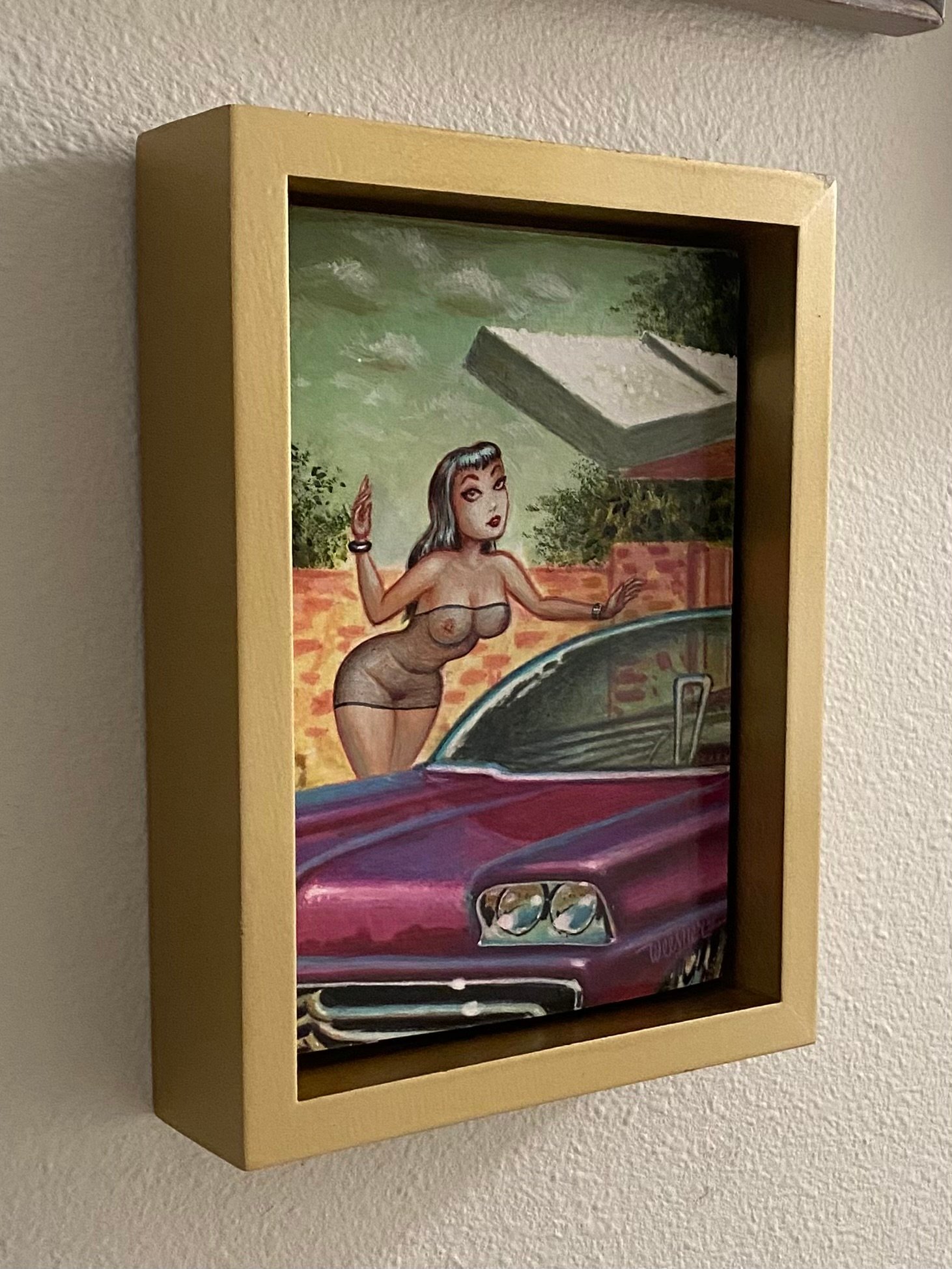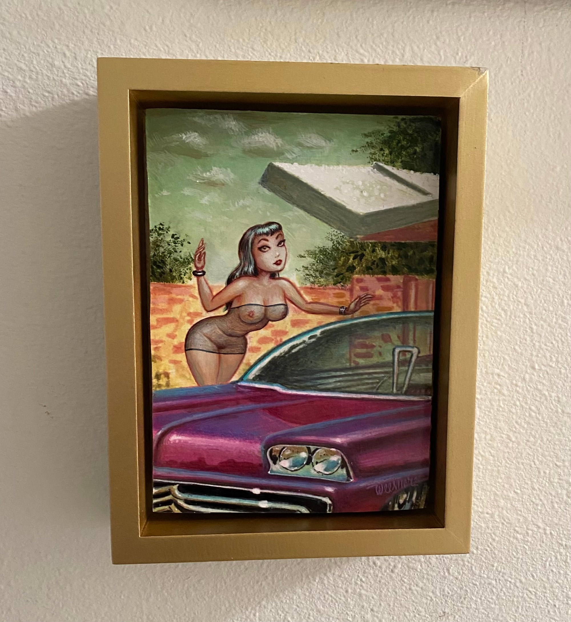 5”x7” acrylic on mounted section of litho print, 75% painted over (new figure, sky, trees, etc. details and color on car) floated in gold frame, ready to hang