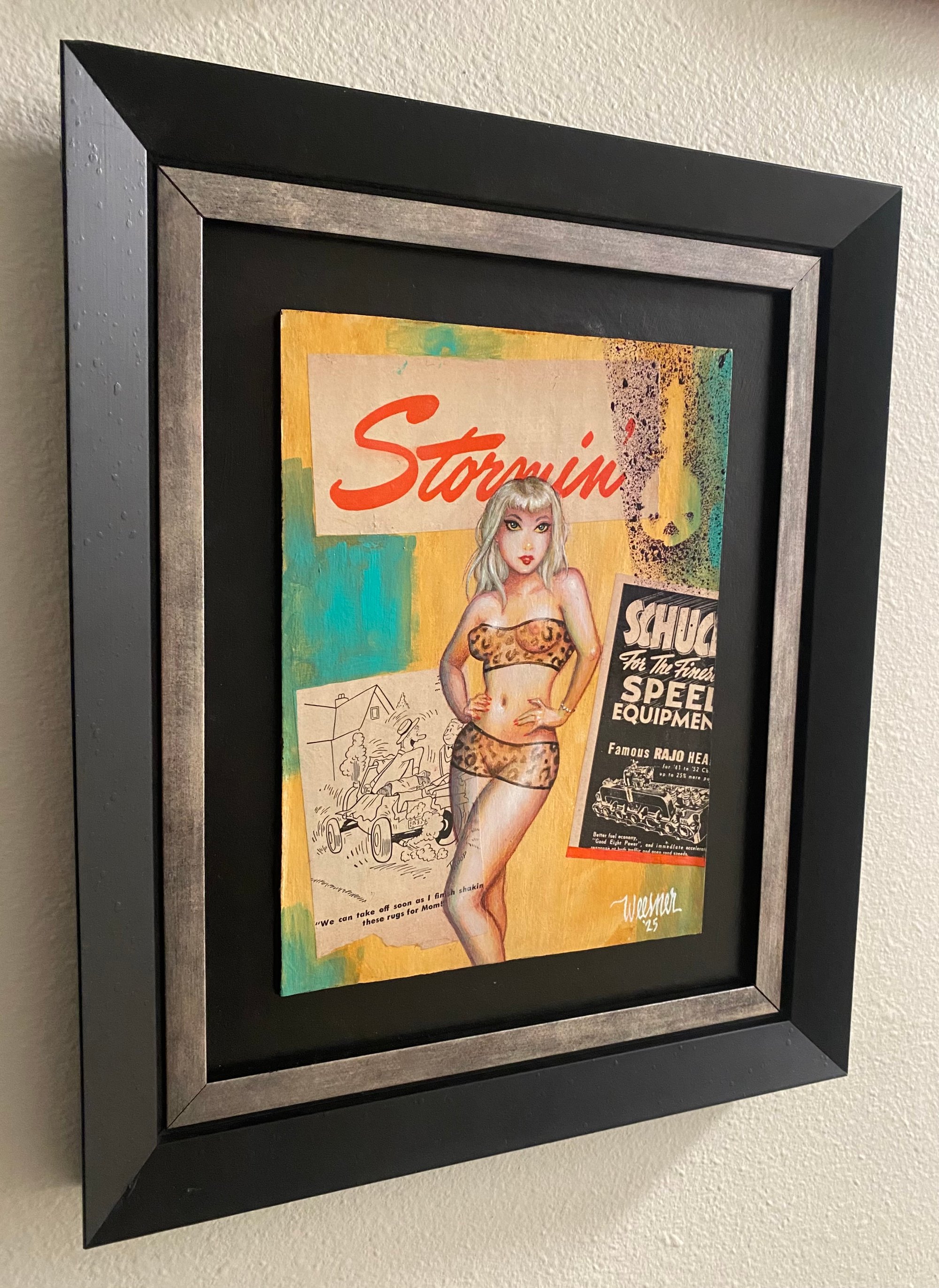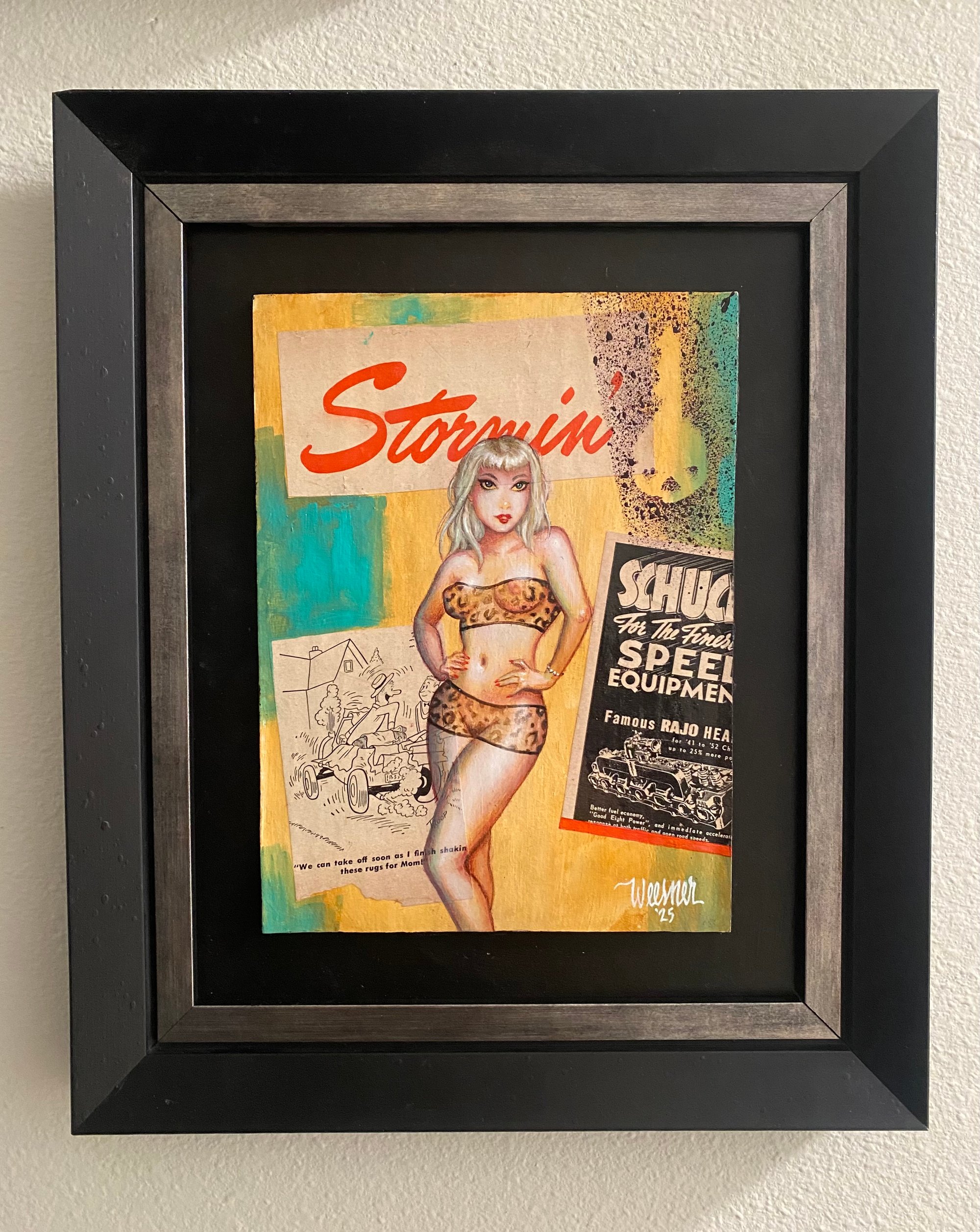 6”x8” acrylic paint on board with vintage Hot Rod Magazine collage, mounted on board and framed, sealed back with hanging wire, ready to hang